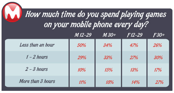 手機遊戲社群MocoSpace最新進行調查,指出女性比男性更沉迷於手機遊戲。這項針對1萬5千名用戶所進行的調查,30歲以上的受訪女性當中,26.7%每天都會玩超過3小時的手機遊戲,同一年齡層男性的比例為18.5%。