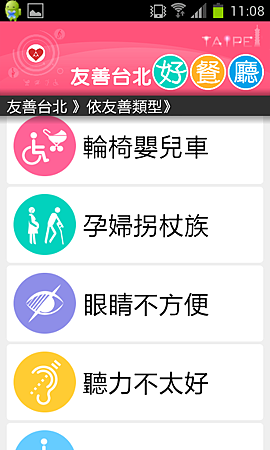 首先,點選「依友善類型」,可以看到很多不同的族群,包括輪椅嬰兒車、孕婦拐杖族、眼睛不方便等,大家可依自己的需求點選。選擇完後,就可以看到符合條件的店家。