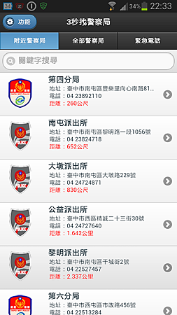 《3秒找警察局》共分為「附近警察局、台灣各縣市的警察局查詢,以及緊急電話列表」三大功能。