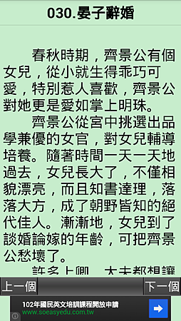 每篇都是一個小故事,內容分為誠信為本、知足常樂、珍惜朋友、慷慨助人、美麗世界、謹言慎行、洞明世事、左右逢源、仁以服眾9個部分。
