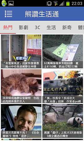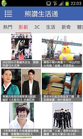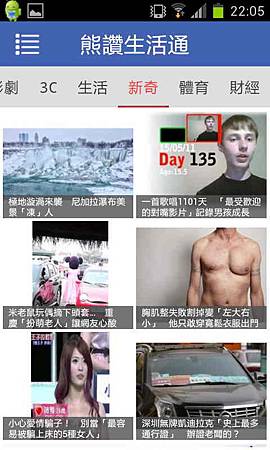首先是「新聞牆」,從影劇、3C、生活、體育、財經的新聞,使用者可選擇想看的新聞類別、新聞內容。