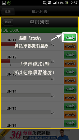 登入後首先點選「學習」,只要進入Study學習模式,系統便會自動記憶你的學習進度,一點都偷懶不得啊XD
