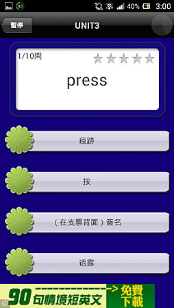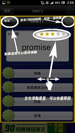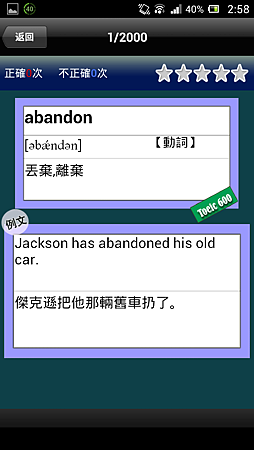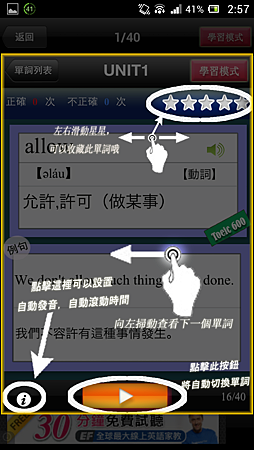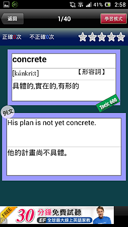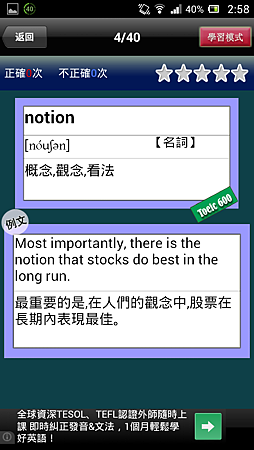 Study學習模式就如同上圖,有英文中文跟例句,碰到不熟悉的單字就加入星號,可以收藏單字哦!