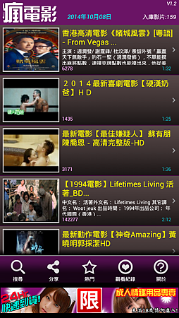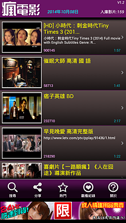 馬上下載了《瘋電影》APP,裡面蒐藏159部電影,天天更新,大家可以慢慢挑:)
